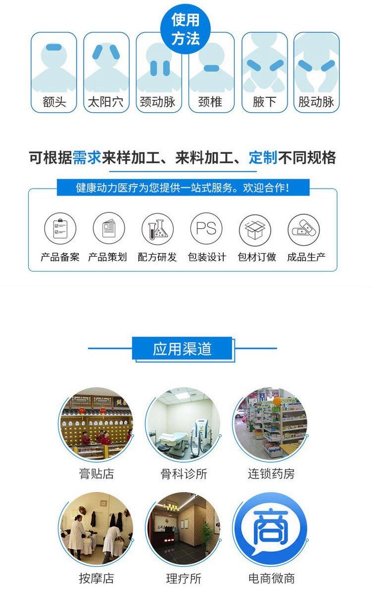 | 使用方法 | 1、打開包裝,去掉保護(hù)膜,將膠層直接貼敷在需要的部位表面即可;2、每貼可持續(xù)使用4~8小時(shí),建議兩貼交替使用,冷藏后使用效果更佳。 |