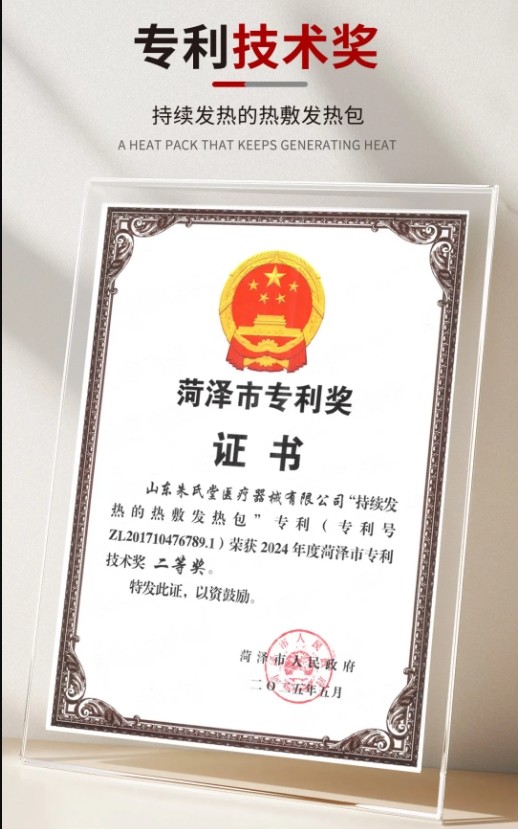 在科技創(chuàng)新的璀璨星空中,山東朱氏堂醫(yī)療器械有限公司憑借雄厚研發(fā)實力與不懈的創(chuàng)新追求,再次閃耀光芒!公司的“持續(xù)發(fā)熱的熱敷發(fā)熱包” 專利(專利號 ZL201710476789.1)在眾多項目中脫穎而出,榮獲 2024 年度菏澤市專利技術獎二等獎,這一榮譽不僅是對朱氏堂技術創(chuàng)新的高度認可,更是其在醫(yī)療器械領域深耕細作、砥礪前行的有力見證。