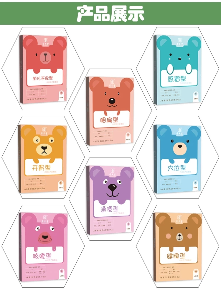 消化不良型、感冒型、咽扁型、開胃型、通便型、咳嗽型、健脾型、穴位型