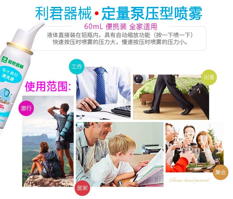 除了能有效緩解鼻炎癥狀以外,產(chǎn)品采用的是定量泵壓型噴霧設計:液體直接裝在鋁瓶內,具有自動縮放功能(按一下噴一下)?焖侔磯簳r的壓力大,慢速按壓式噴霧的壓力小。如此貼心、人性化的設計大大加強了產(chǎn)品的使用舒適度和方便性。另外,產(chǎn)品設置了60ml的規(guī)格,瓶身小巧,便于攜帶,方便隨時隨地使用。