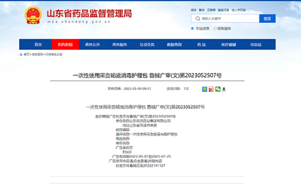 近日,經(jīng)山東省藥品監(jiān)督管理局批準(zhǔn),山東朱氏藥業(yè)集團(tuán)推出的新品-——一次性使用采血輸液消毒護(hù)理包已經(jīng)通過廣審備案。魯械廣審文號為第2023052507號。該產(chǎn)品主要適用臨床采血或輸液時消毒護(hù)理用。