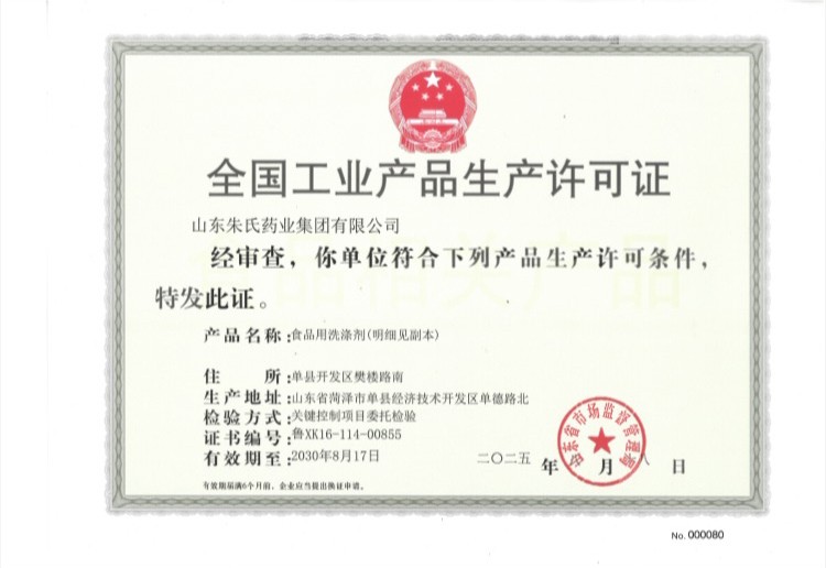 喜訊!山東朱氏藥業(yè)集團獲食品用洗滌劑生產許可證!