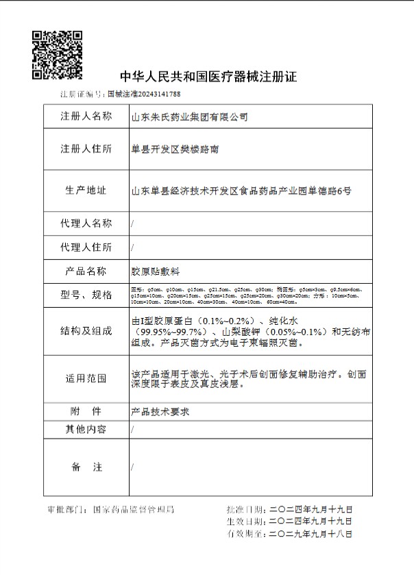 在醫(yī)用敷料領(lǐng)域,“械字號(hào)” 等級(jí)直接決定產(chǎn)品的市場(chǎng)準(zhǔn)入與信任權(quán)重,而三類醫(yī)療器械注冊(cè)證更是公認(rèn)的 “行業(yè)*高門檻”。山東朱氏這款膠原貼能實(shí)現(xiàn)上市即**,首先源于其手握的國(guó)械注準(zhǔn) 20243141788 號(hào)三類注冊(cè)證,這張證書背后是遠(yuǎn)超普通產(chǎn)品的嚴(yán)苛考驗(yàn)。