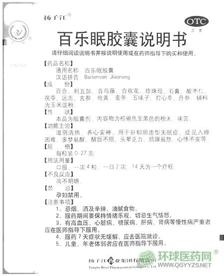 - 本頁面信息僅供參考,請以產(chǎn)品實際附帶說明書為準。 揚子江牌 百樂眠膠囊 說明書 文字版 商品名:百樂眠 通用名:百樂眠膠囊