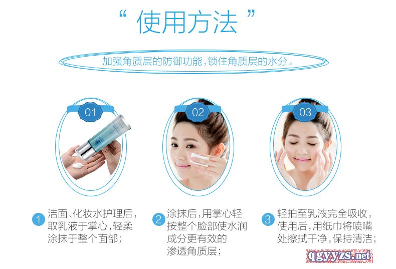 | 使用方法 | 先將適量的營養(yǎng)液倒入掌心中,由臉部易干燥的臉頰或眼睛四周開始涂抹。沿肌肉走向輕輕抹開。干性膚質可以多涂一些,“t”型區(qū)要少抹一些,涂得太多或油性膚質者,營養(yǎng)液的選擇也非常重要 |