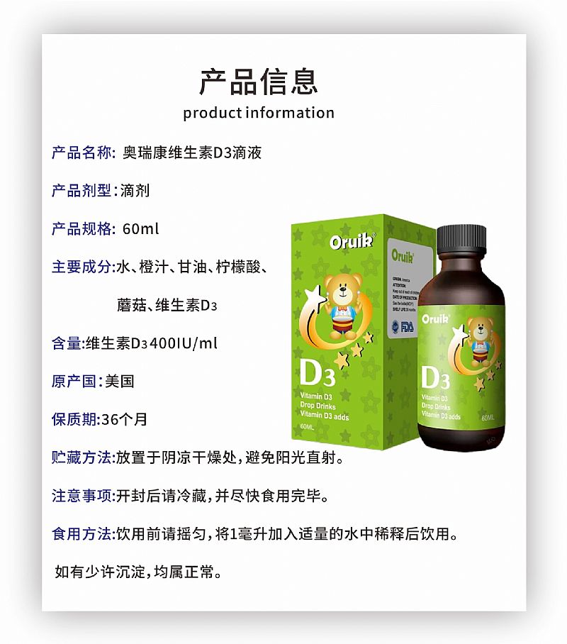 | 產(chǎn)品名稱 | 美國原裝進口維生素D3滴液 |