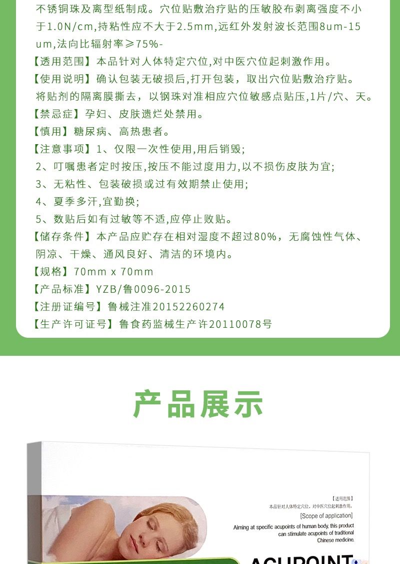 | 產(chǎn)品用途 | 本品針對人體特定穴位,對中醫(yī)穴位起刺激作用。 |