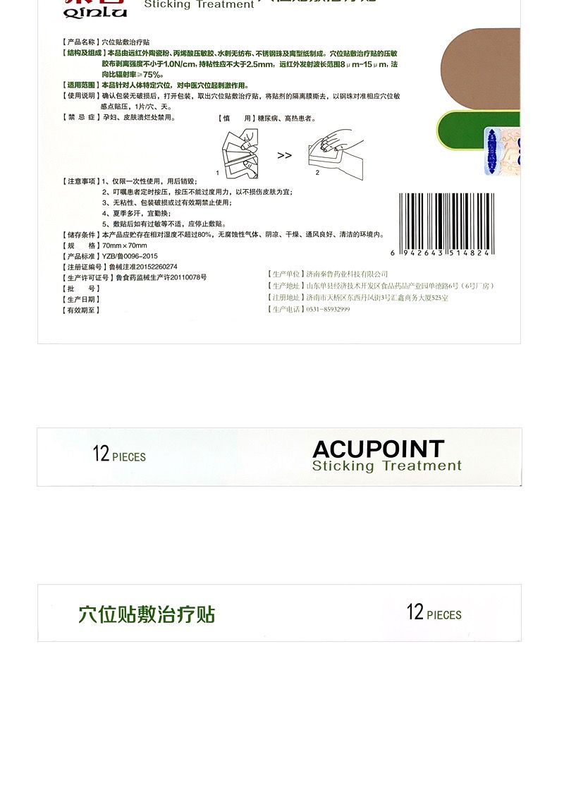 | 使用方法 | 1、清潔相應(yīng)穴位,先以拇指依次揉按相應(yīng)穴位,每穴1~2分鐘,范圍由小到大,力量由輕到重,探尋敏感點(diǎn)。2、確認(rèn)包裝無破損后,打開包裝,取出穴位貼敷治療貼,將貼劑的隔離膜撕去,以鋼珠對準(zhǔn)相應(yīng)穴位敏感點(diǎn)貼壓,1片/穴、天,每日適度按壓3~5次,每次3~5分鐘,1個療程為10天,療程間隔2~3天。 |