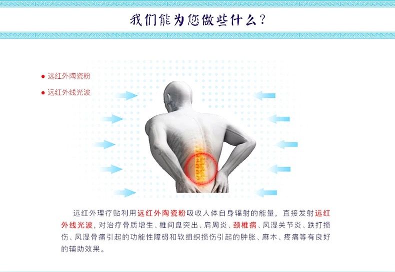 | 使用方法 | 清潔患處,確認包裝無破損后,打開包裝,取出遠紅外理療貼,將貼劑的隔離膜撕去,貼于患處,貼敷時間24小時。 |