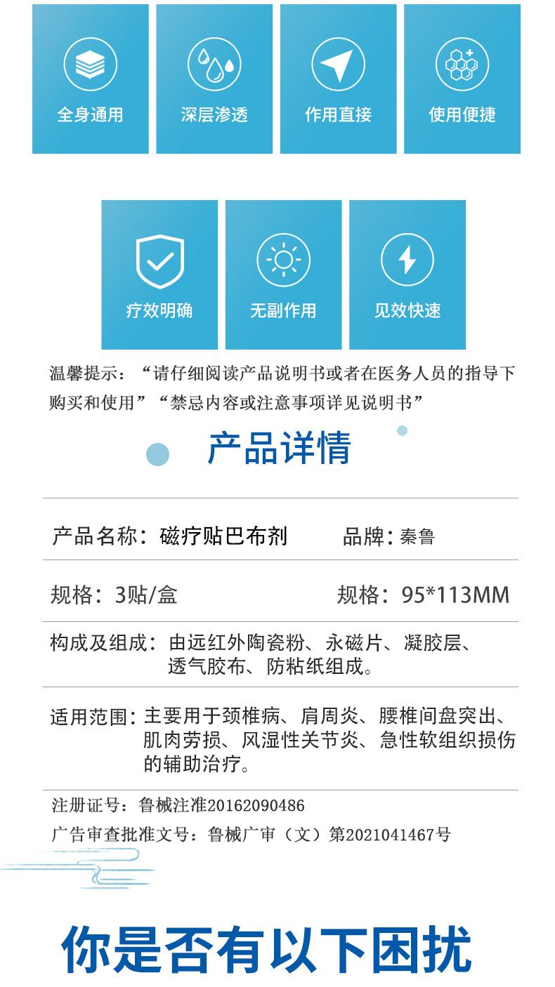 | 補(bǔ)充說(shuō)明 | [注意事項(xiàng)] 1、僅限一次性使用,用后銷(xiāo)毀; 2、包裝如有破損,嚴(yán)禁使用; 3、使用時(shí)嚴(yán)格按照使用說(shuō)明進(jìn)行; 4、敷貼后無(wú)熱感,如有過(guò)敏等不適,應(yīng)停止敷貼; 5、防止?fàn)C傷。 [禁忌癥]白細(xì)胞點(diǎn)數(shù)4000以下、體質(zhì)極度衰弱、高熱及重危患者,體內(nèi)置有心臟起搏器者、代償不全的心臟病患者,患有活動(dòng)性結(jié)核、嚴(yán)重動(dòng)脈硬化、出血傾向者,患有皮膚病、急性期炎癥患者、皮膚潰瘍處禁用,磁療副作用明顯不能耐受治療者以及孕婦下腹部禁用。 [儲(chǔ)存條件]本產(chǎn)品應(yīng)貯存在相對(duì)濕度不超過(guò)80%,無(wú)腐蝕性氣體、干燥、通風(fēng)良好、清潔的環(huán)境內(nèi)。 |