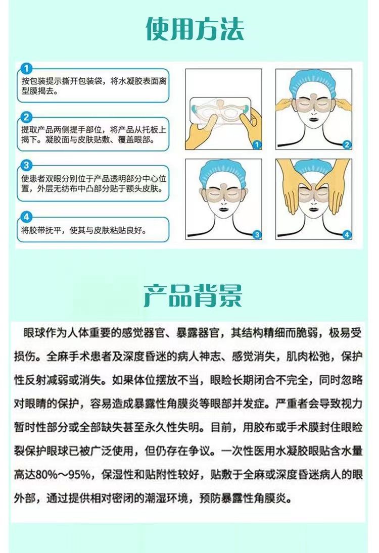 | 使用方法 | 1、醫(yī)護(hù)人員將產(chǎn)品從包裝中取出,去掉隔離層,將水凝膠層貼敷于患者眼部。2、若用于全麻手術(shù)病人,建議在麻醉誘導(dǎo)期即開(kāi)始使用,提前給患者眼部營(yíng)造潮濕環(huán)境。3、可持續(xù)貼敷7-12小時(shí)/貼。 |