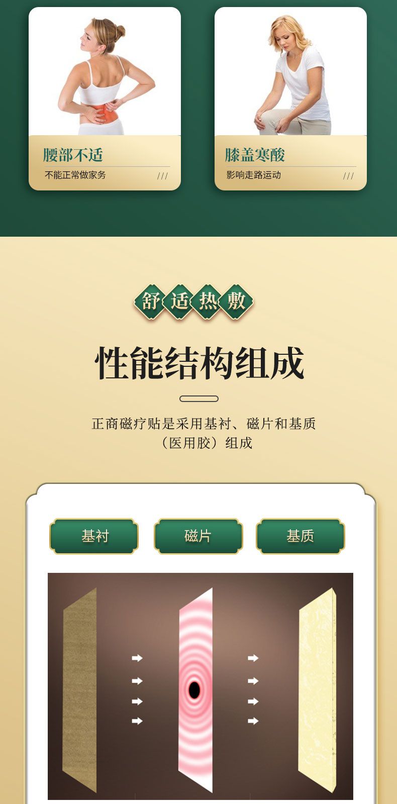 | 使用方法 | 根據(jù)患者需要貼敷的部位及大小來(lái)進(jìn)行型號(hào)及尺寸的選擇,清潔患處,確認(rèn)包裝無(wú)破損后,打開(kāi)包裝,取出磁療貼,將貼劑的隔離膜撕去,貼于患處。 |