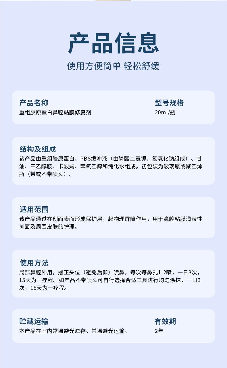 | 產品名稱 | 重組膠原蛋白鼻腔粘膜修復劑 |