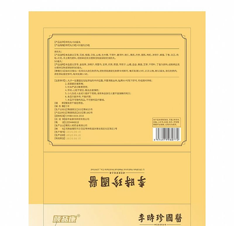 | 主要成分 | 排抗丸:本品是以艾草,花椒、桂圓,貝母、山楂,生大黃,干荷葉,番瀉葉,桃仁,黃芪,丹參、茵陳,枸杞,決明子,蜂蜜,丁香、白芷、肉桂,紅花,凡士林為原料,經(jīng)粉碎后充分?jǐn)嚢鑹褐瞥汕驙畹呐趴雇琛?br>SOSO丸:本品是以獲苓、金錢草、決明子,何首烏,甘草、枳殼,陳皮、車前子、山楂、百合、桑葚、艾草、干荷葉,丁香為原料,經(jīng)粉碎后充分?jǐn)嚨魤褐瞥汕驙畹腟OSS丸. |
