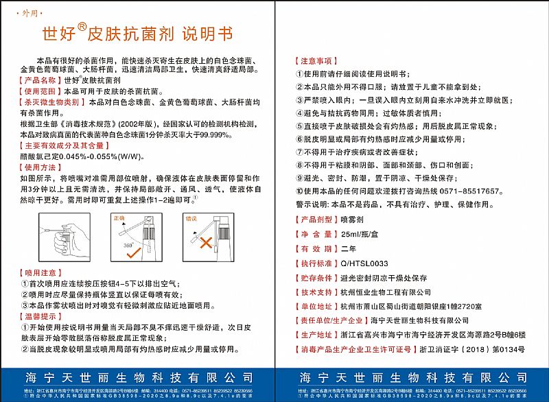 | 補(bǔ)充說明 | 【使用范圍】本品可用于皮膚的殺菌抗菌。 【殺滅微生物類別】本品對(duì)白色念珠菌、金黃色葡萄球菌、大腸桿菌均有殺菌作用。 根據(jù)衛(wèi)生部《消毒技術(shù)規(guī)范》(2002年版),經(jīng)國家認(rèn)可的檢測(cè)機(jī)構(gòu)檢測(cè)本品對(duì)致病真菌的代表菌種白色念珠菌1分鐘殺滅率大于99.999%。 【使用方法】 將噴嘴對(duì)準(zhǔn)需用部位噴射,確保液體在皮膚表面停留和作用3分鐘以上且無需清洗,并保持局部敞開、通風(fēng)、透氣,使液體自然晾干更好。需用時(shí)即可重復(fù)上述操作1-2遍即可。 【噴用注意】 1、首次噴用應(yīng)連續(xù)按壓按鈕4-5下以排出空氣; 2、噴用時(shí)應(yīng)盡量保持瓶體豎直以**每噴有效; 3、本品作霧狀噴出時(shí)對(duì)嗅覺有輕微刺激應(yīng)貼近地面噴用。 【溫馨提示】 1、開始使用按說明書用量當(dāng)天局部不臭不癢迅速干燥舒適,次日皮膚表層開始零散脫落俗稱脫皮屬正,F(xiàn)象; 2、當(dāng)脫皮現(xiàn)象較明顯或噴用局部有灼熱感時(shí)應(yīng)減少用量或停用。 【注意事項(xiàng)】 1、使用前請(qǐng)仔細(xì)閱讀使用說明書; 2、本品只能外用不得口服;請(qǐng)放置于兒童不能拿到處; 3、嚴(yán)禁噴入眼內(nèi);一旦誤入眼內(nèi)立刻用自來水沖洗并立即就醫(yī); 4、避免與拮抗藥物同用;過敏體質(zhì)者慎用; 5、直接噴于皮膚破損處會(huì)有灼熱感;用后脫皮屬正,F(xiàn)象; 6、脫皮明顯或局部有灼熱感時(shí)應(yīng)減少用量或停用; 7、不得用于治療疾病或者改善癥狀; 8、不得用于粘膜和陰部、面部和頸部、傷口和創(chuàng)面; 9、避光、密封、防潮,置于陰涼、干燥處保存; 10、使用本品的任何問題歡迎撥打咨詢熱線0571-85517657。 警示說明: 本品不是藥品,不具有治療、護(hù)理、保健作用。 |
