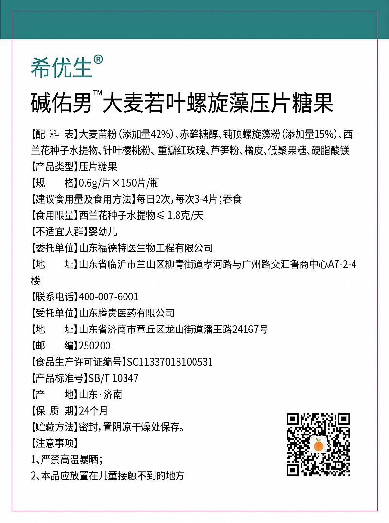 | 產(chǎn)品名稱 | 堿佑男™大麥若葉螺旋藻壓片糖果 |