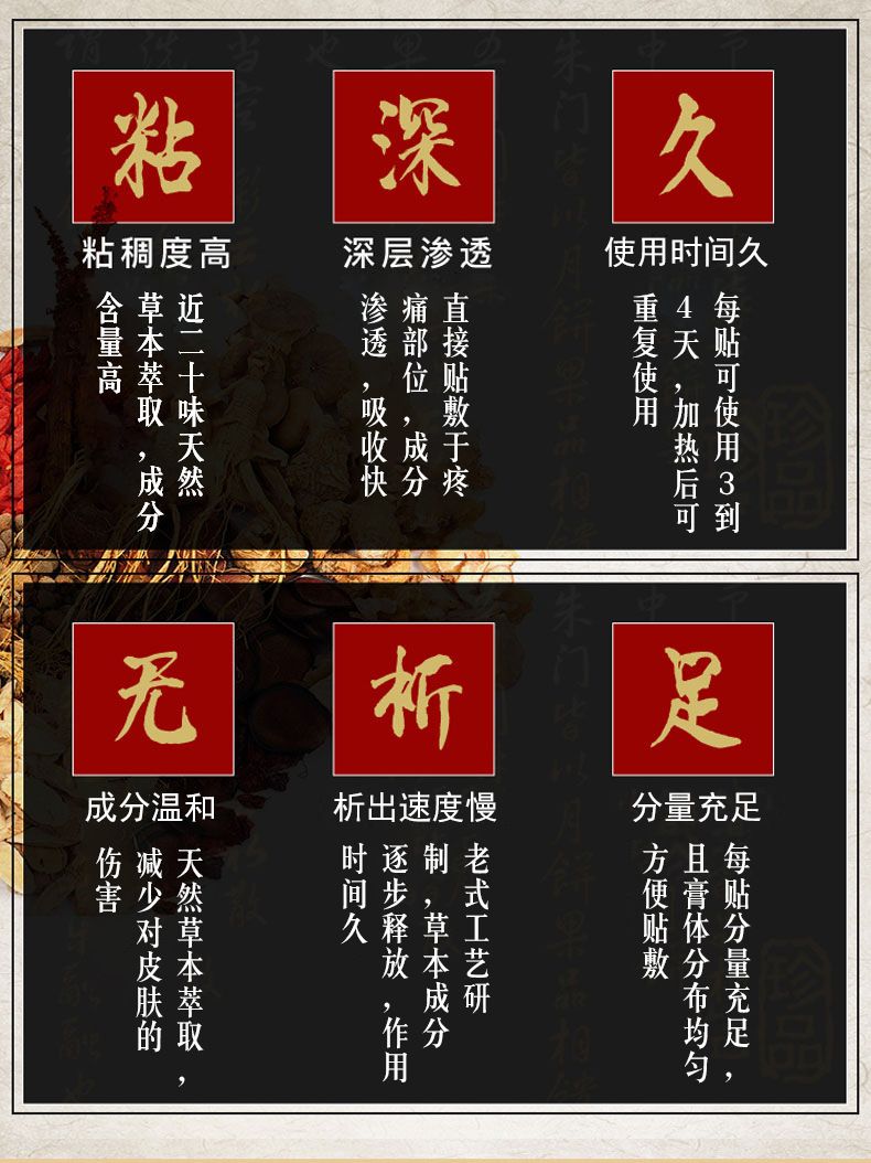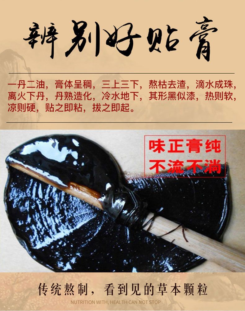 | 主要成分 | 黑膏藥是由各類草本植物提取物配比煉制而成的外用膏劑,經(jīng)古法熬制而成。 |