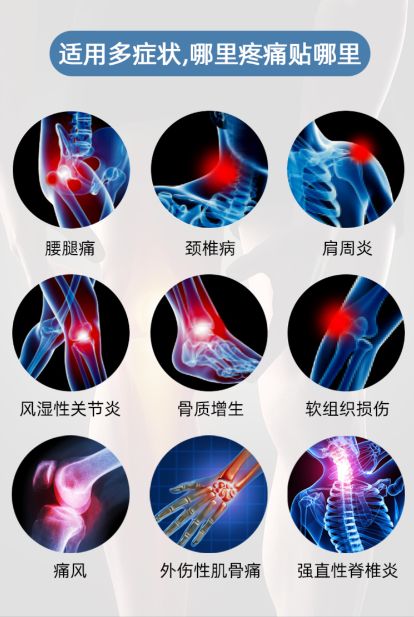 | 產品用途 | 促進局部血液循環(huán),輔助消炎,消腫和止痛。一型適用于肩周炎,關節(jié)炎,頸椎病,腰椎間盤突出,腰肌勞損,足跟痛,骨關節(jié)炎,膝骨關節(jié)炎,骨質增生,腱鞘炎,跌打損傷,扭挫傷引起的疼痛的輔助治療。 |