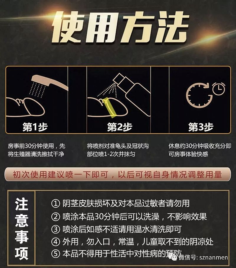 | 使用方法 | 將本品均勻噴于陰莖龜頭及冠狀溝部位1-2下,待15分鐘后被皮膚完全吸收,可達到最佳效果(此時清洗也不會影響效果)。 |