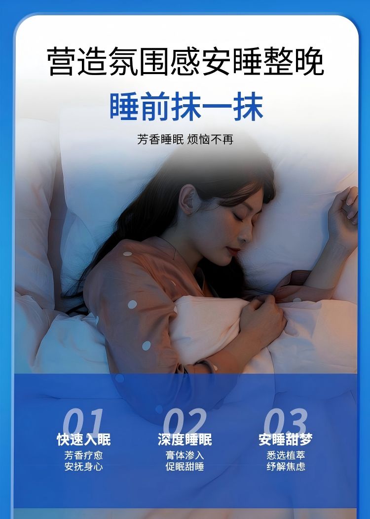 | 使用方法 | 外用。每日睡前20至30分鐘,取黃豆粒大小的凝膠,均勻涂抹于上臂內(nèi)側(cè)或手腕內(nèi)側(cè)等皮膚較薄且血管豐富區(qū)域,輕柔按摩至完全吸收即可無需清洗。輕度失眠者每日一次即可:中度失眠者可適當增加用量或使用范圍重度失眠者建議每晚使用兩次,分別在晚上8點和臨睡前各一次,以增強放松效果。 |